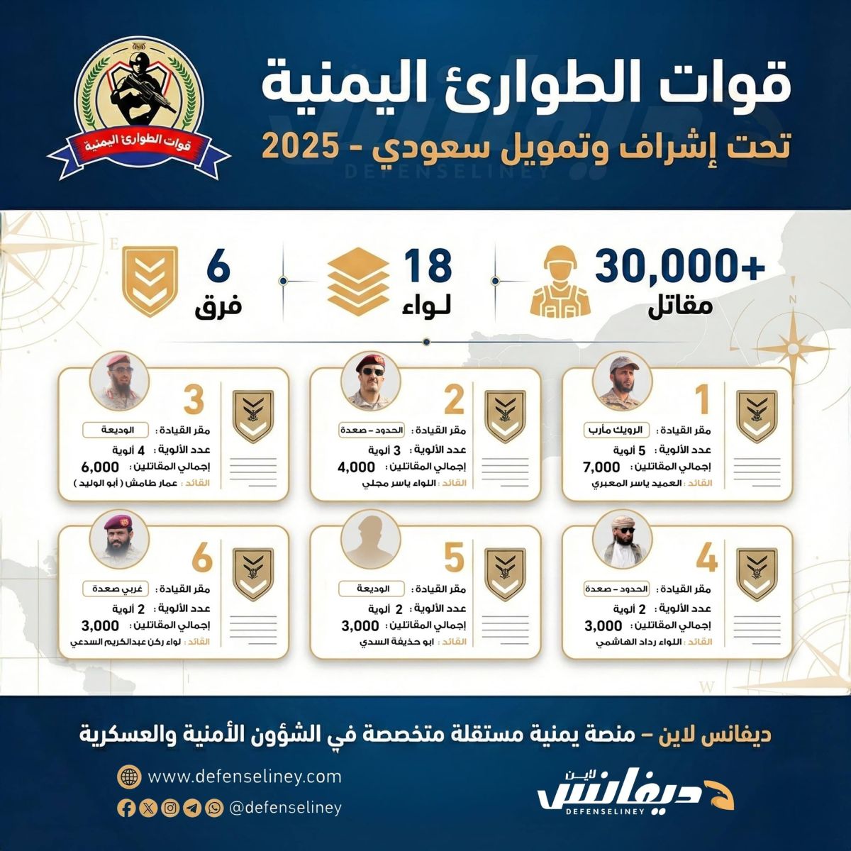 منتصف العام الحالي 2025، ظهر مسمى "قوات الطوارئ اليمنية" كأحدث تشكيل قتالي ينضم الى قائمة التشكيلات المسلحة في الجبهة المناهضة للحوثيين والتابعة للمجلس الرئاسي وتحالف دعم الشرعية الذي تقوده السعودية، وتشارك الإمارات بشكل نشط تحت اسم التحالف منذ عام 2015.
