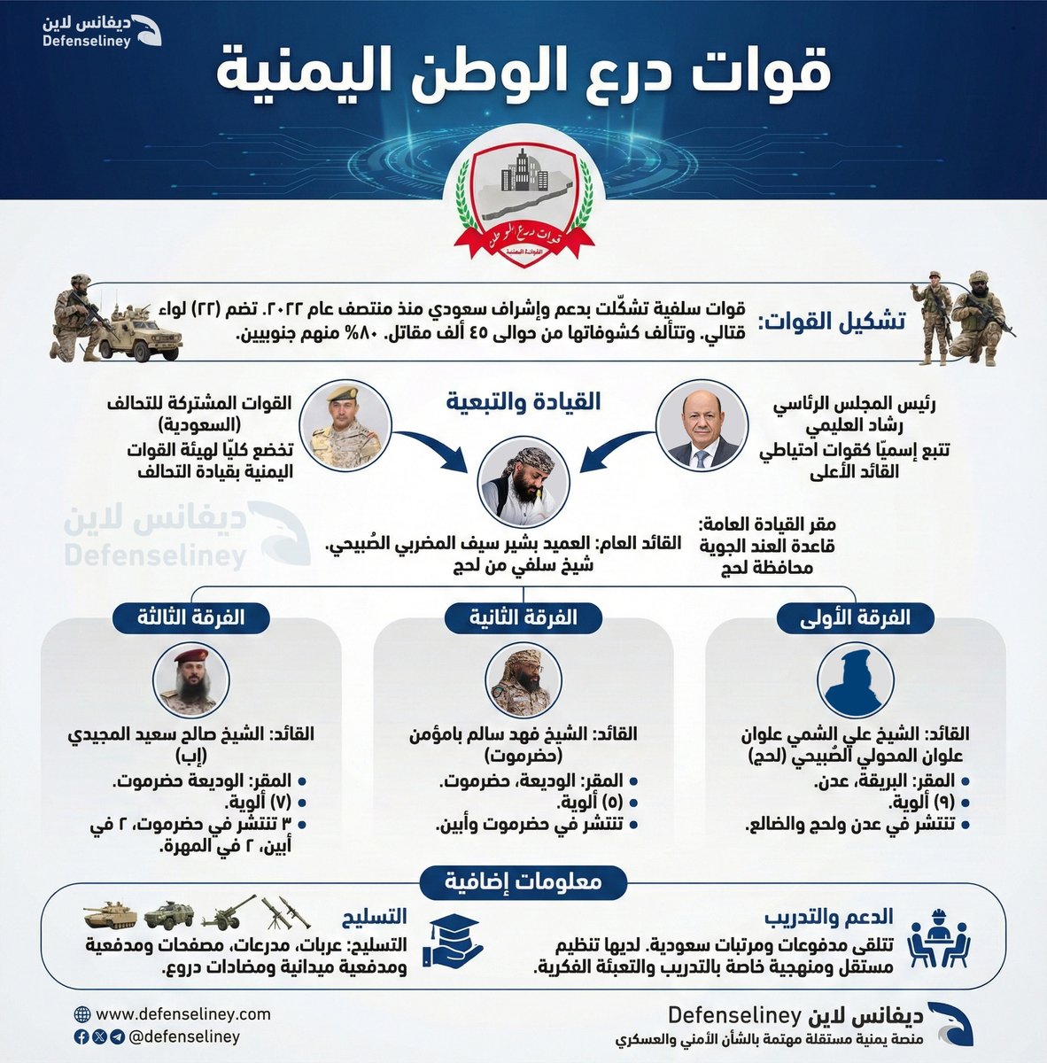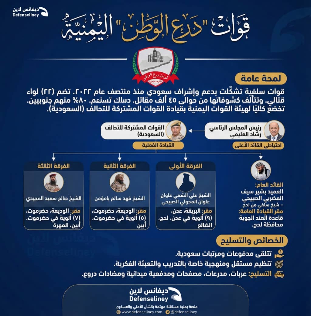 قوات "درع الوطن" هي قوات سلفية عقائدية، بدأ تشكيلها مطلع عام 2022 بدعم سعودي، بعض قادتها ومقاتليها خرجوا من رحم "ألوية العمالقة الجنوبية".