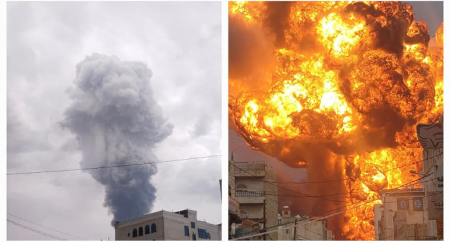 ▪️خزّانات للغاز (2 خزّانات كبيرة) في شارع الجزائر بمديرية عصر. حيث تم استهداف الخزانات بغارتين على الأقل نتج عنها انفجارات عنيفة وتصاعدت النيران وأعمدة الدخان من الموقع بكثافة.